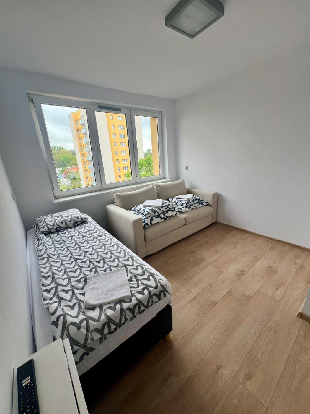 Pokój Czteroosobowy z balkonem. This quadruple room features a shared bathroom, and a dining area. The well-equipped kitchen has a stovetop, a refrigerator, kitchenware and an oven. Boasting a balcony, this quadruple room also offers a washing machine, a tea and coffee maker and a flat-screen TV. The unit has 3 beds. Pokój Czteroosobowy - 4 osobowy. Powierzchnia pokoju ok.: 15 mkw. ;