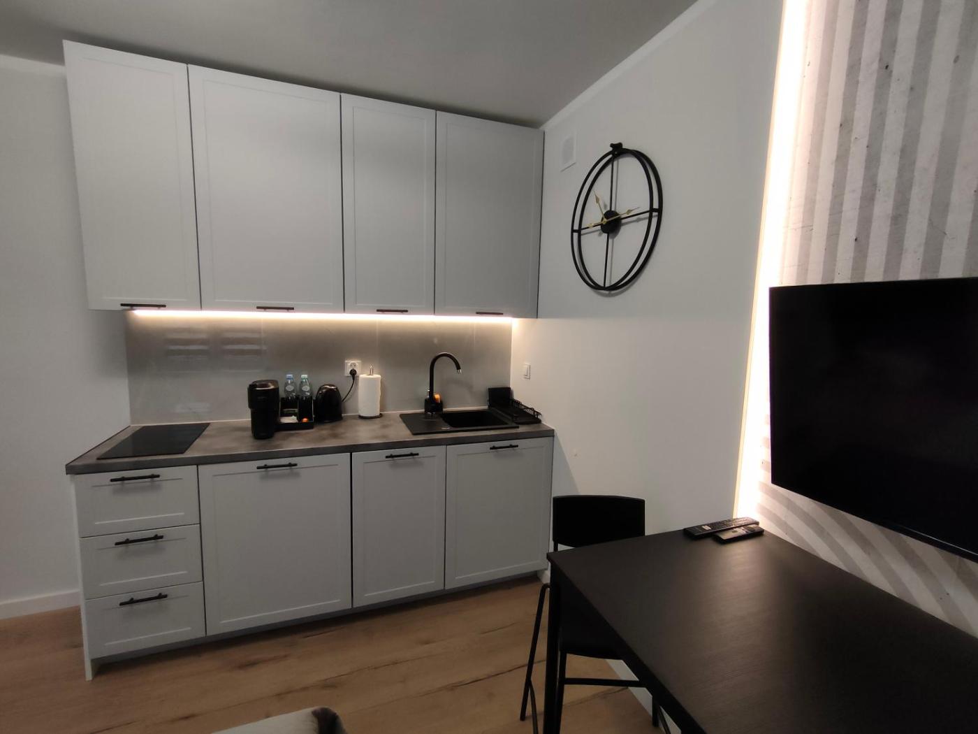 Apartament z 1 sypialnią. This apartment is comprised of 1 bedroom, a kitchenette and 1 bathroom with a shower and a hairdryer. In the well-equipped kitchenette, guests will find a stovetop, a refrigerator, a dishwasher and kitchenware. This apartment features a coffee machine, heating, a flat-screen TV and garden views. The unit offers 1 bed. Apartament - 2 osobowy. Powierzchnia pokoju ok.: 20 mkw.