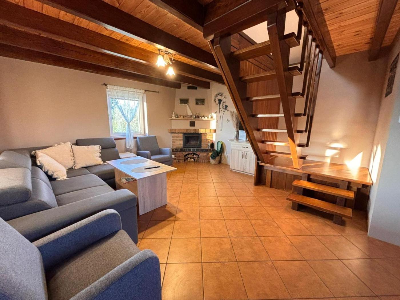 Dom wakacyjny. This holiday home features a fireplace. This holiday home features 1 living room, 2 separate bedrooms and 1 bathroom with a shower and free toiletries. Guests will find a stovetop, a refrigerator, kitchenware and a microwave in the well-fitted kitchenette. The holiday home also comes with a barbecue. Boasting a terrace with garden views, this holiday home also features a wardrobe and a flat-screen TV. The unit has 7 beds. Dom wakacyjny - 6 osobowy. Powierzchnia pokoju ok.: 54 mkw.